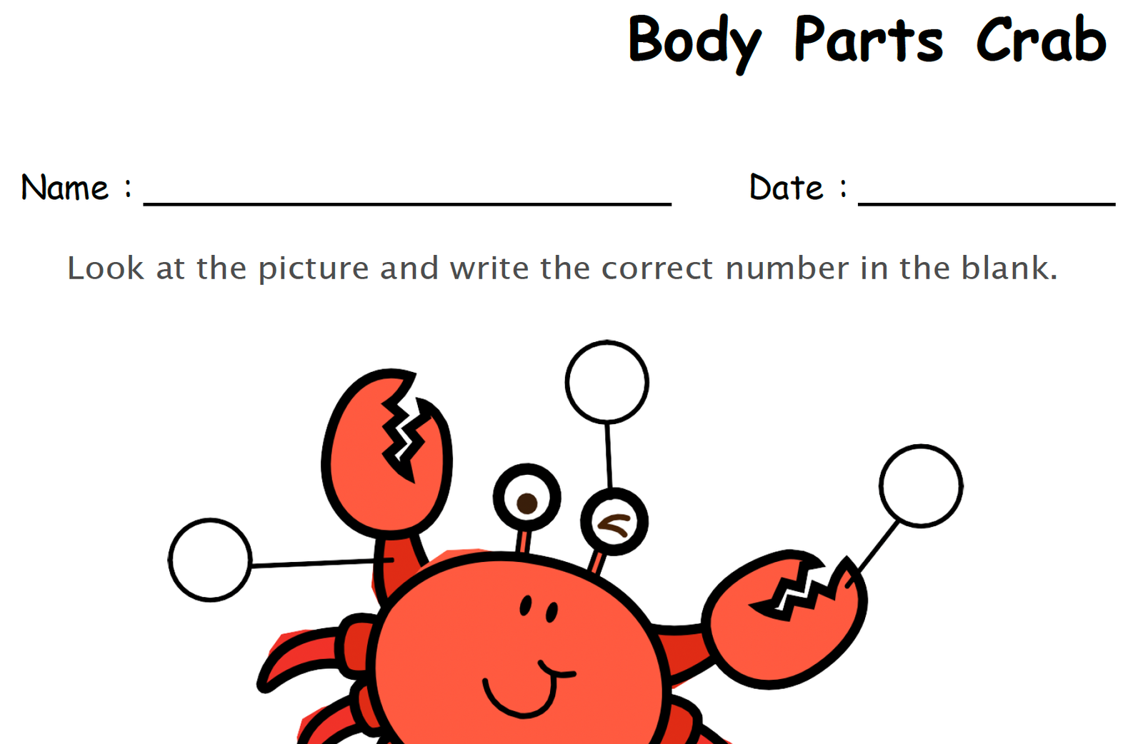 This printable worksheet introduces children to the basic anatomy of a crab in a clear, kid-friendly format. With easy-to-understand illustrations and guided labeling spaces, it helps kids build strong observation skills, improve vocabulary, and learn about marine animals in an enjoyable way.